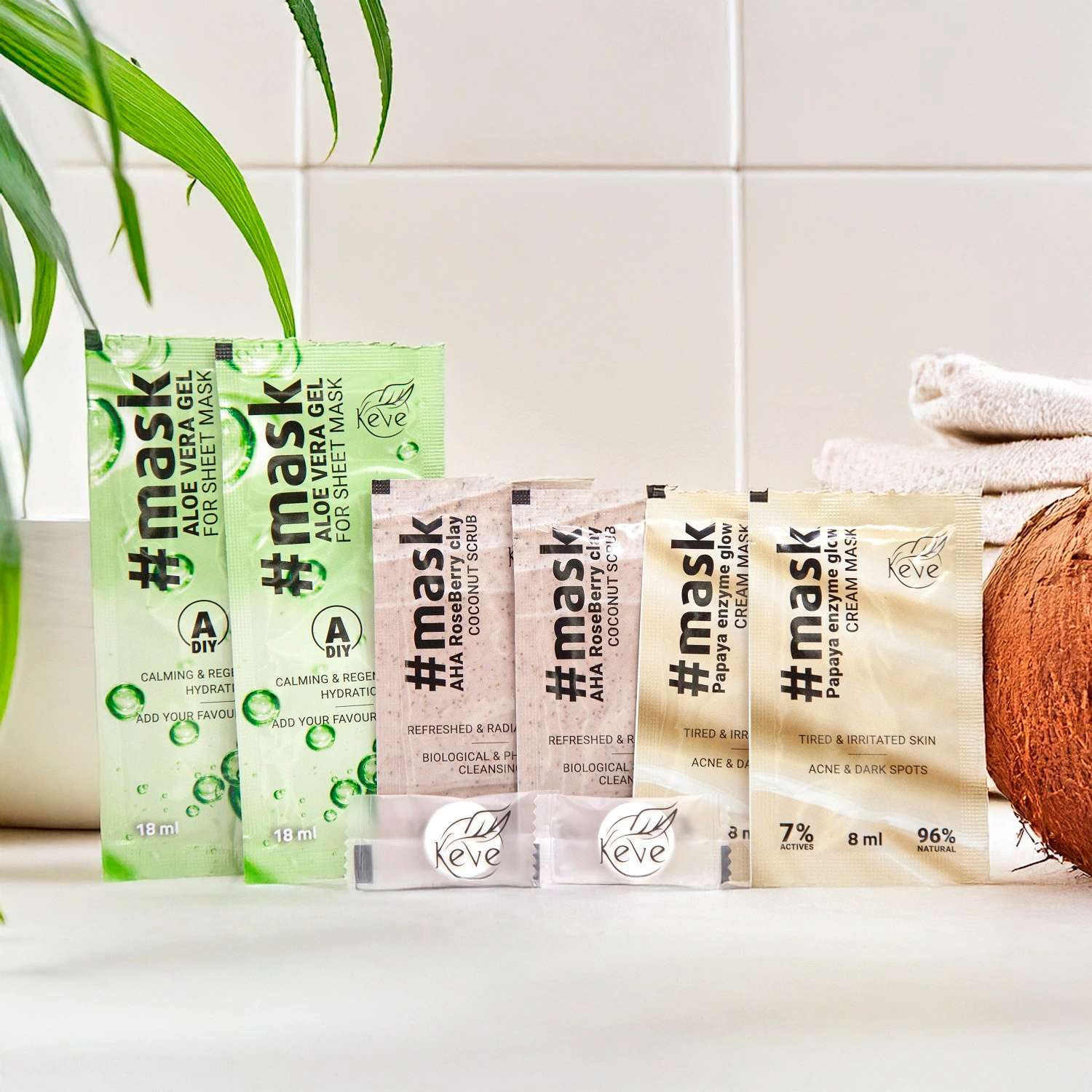Aloe vera gél fátyolmaszk – Nyisd fel a KEVE fátyolmaszk gél tasakját, és keverj hozzá 3-5 cseppet kedvenc KEVE szérumodból vagy esszenciádból. Tedd a tasakba a kicsomagolt maszk tablettát, és hagyd benne, amíg teljesen magába szívja a formulát. Hajtogasd ki a maszkot, és gyengéden igazítsd el az arcodon, majd hagy hatni 10-15 percig. A maszk eltávolítása után maradó szérumot masszírozd be, és hagyd teljesen beszívódni.